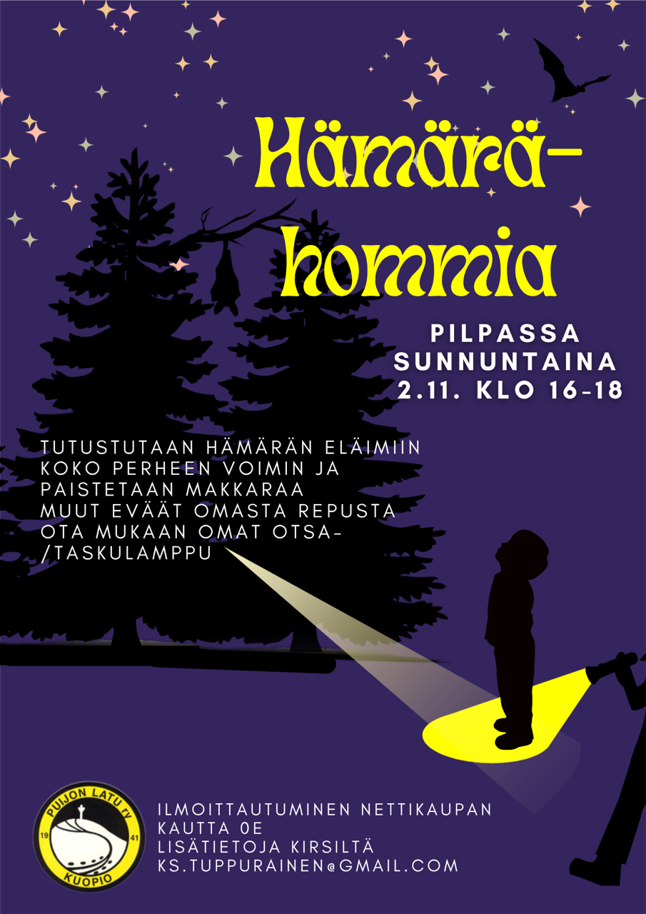 Tutustutaan hämärän eläimiin koko perheen voimin ja paistetaan makkaraa. Muut eväät omasta repusta. Ota mukaan omat otsa- tai taskulamput. Tapahtuma on maksuton, lisätietoja Kirsiltä ks.tuppurainen@gmail.com.